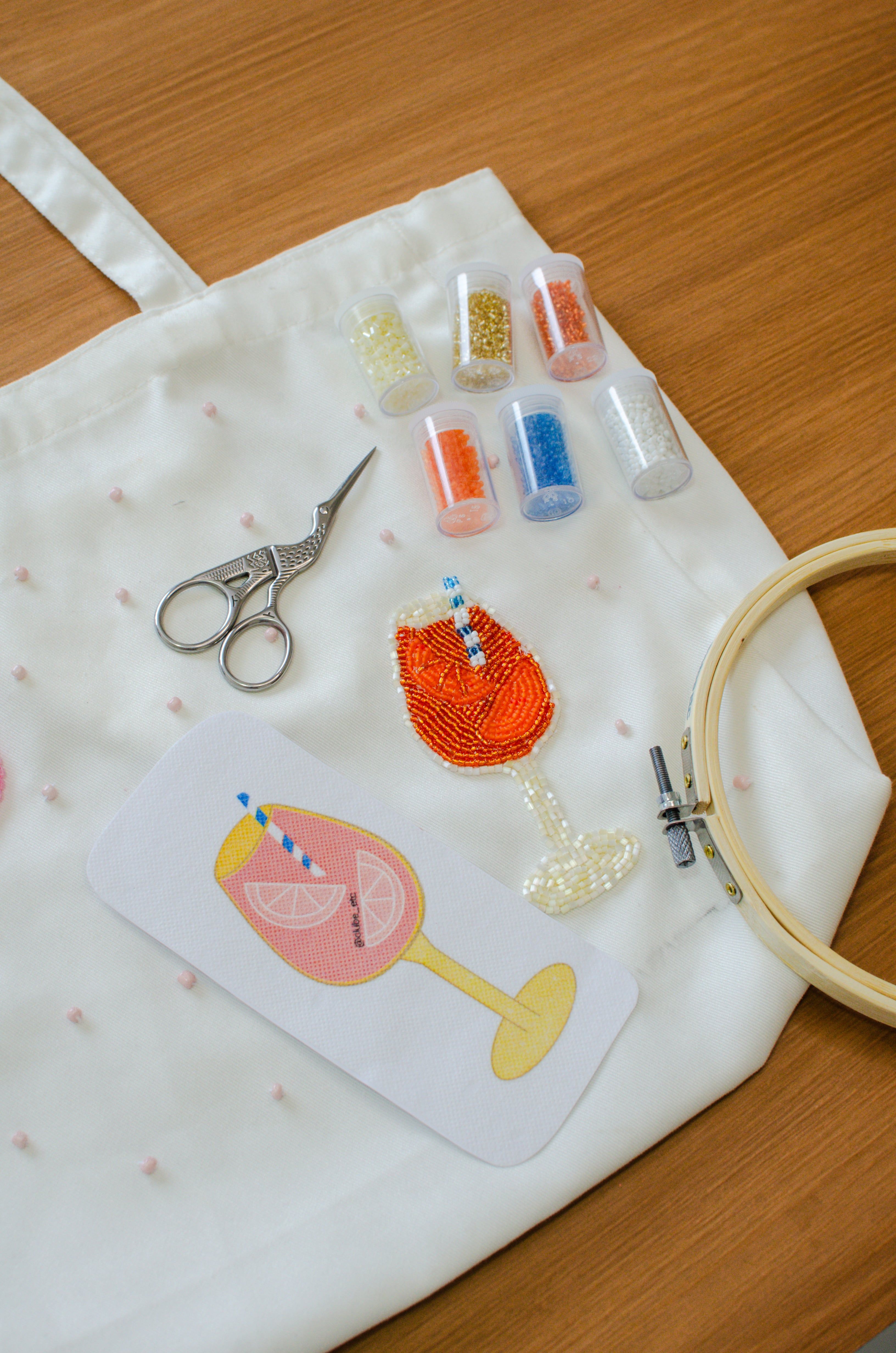 - Para acompanhar o frescor da primavera, esse mês bordaremos um drink de Aperol e uma Flor de Hibisco com miçangas e vidrilhos.