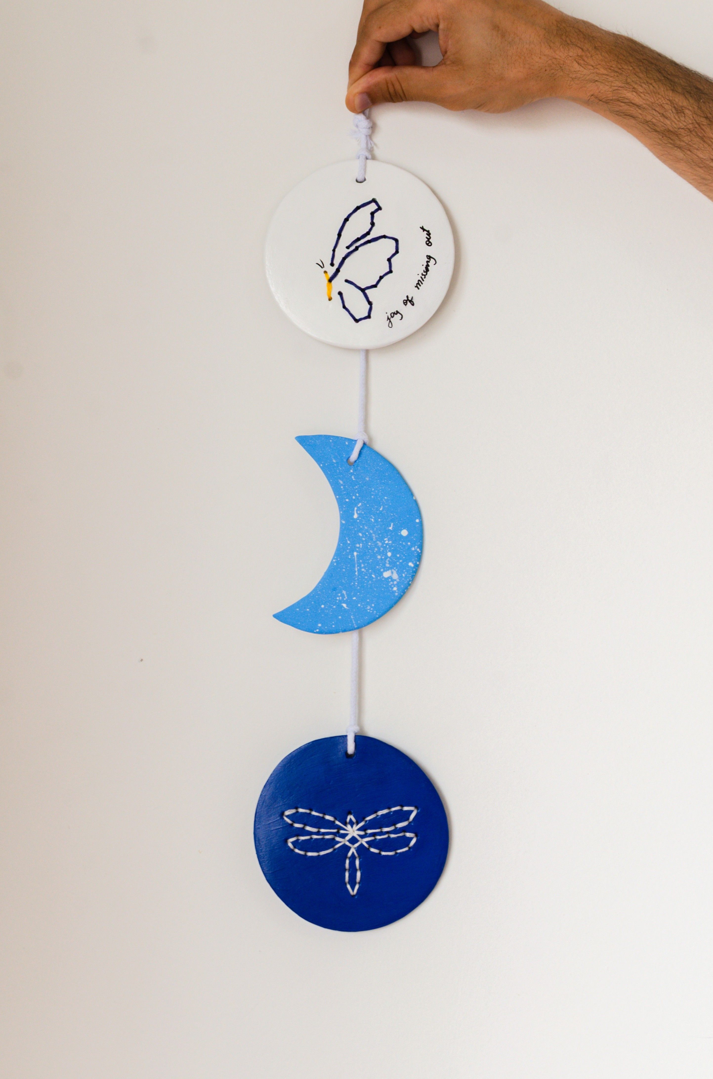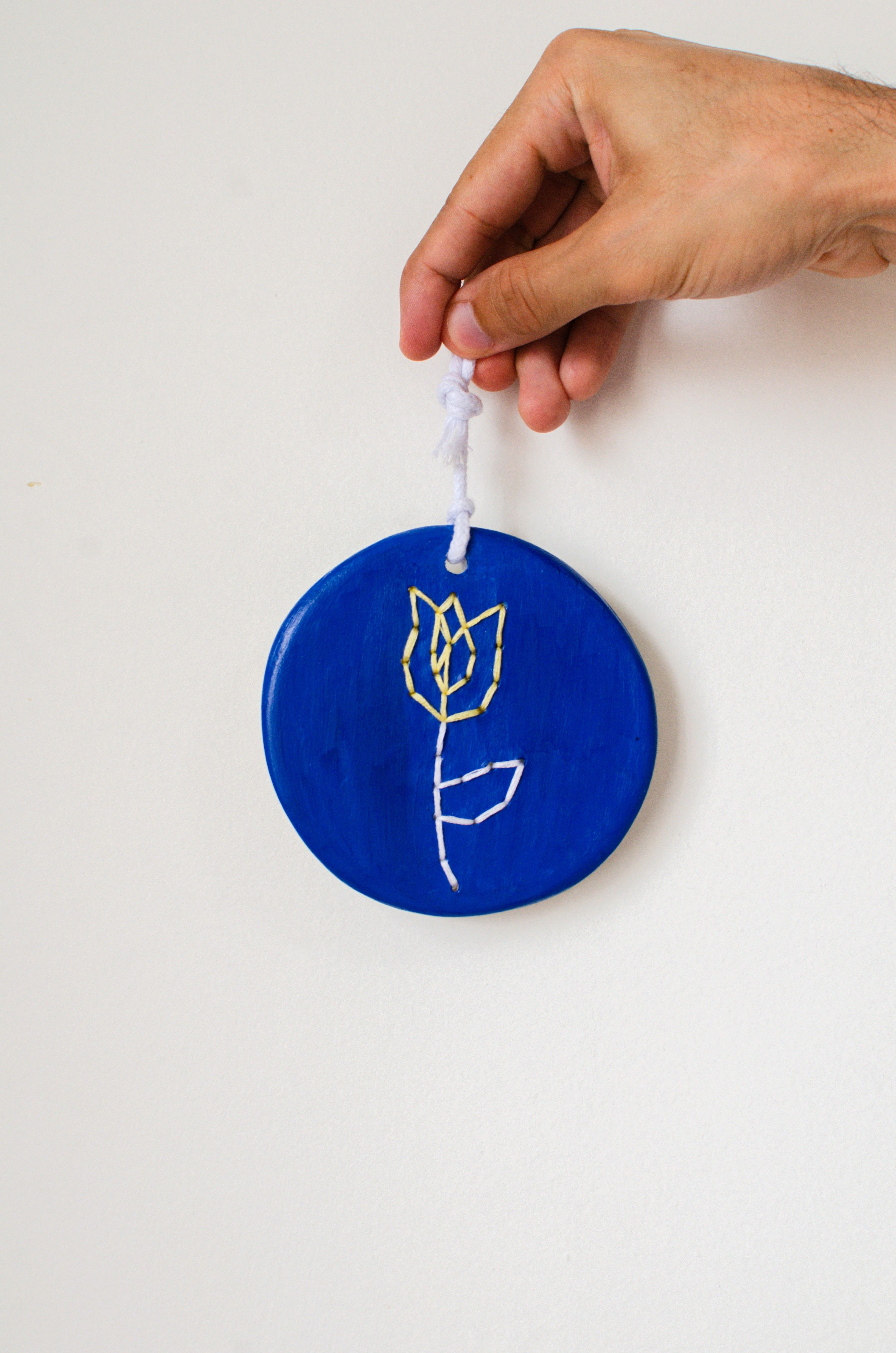 - Caixa de Cerâmica Fria com projeto de pendentes decorativos bordados, criados como plaquinhas artesanais que podem ser furadas e bordadas com ilustrações ou letras.